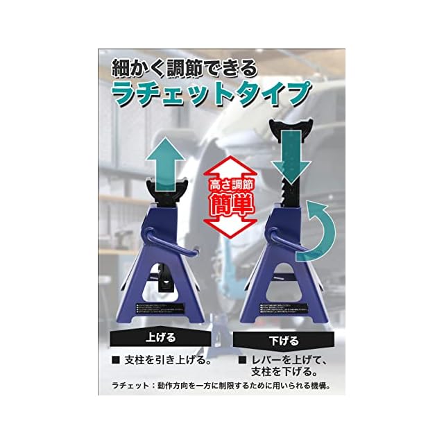 ●調節:10段●最大耐荷重:3t(2台使用時)●最低/最高地上高:約290㎜/415㎜●ストローク:約125㎜●本体サイズ:約195(W)×290(H)×176(D)㎜●重さ:約3.15㎏×2台