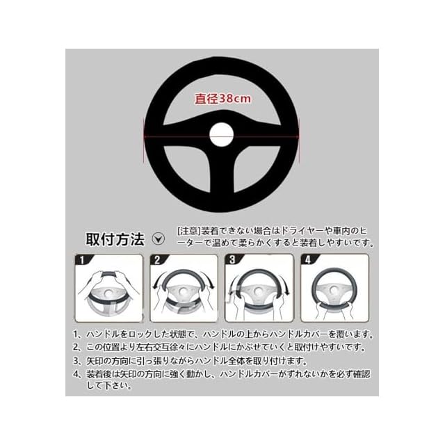 【製品仕様】:形状は円形〈通常丸型)、サイズは38CM、37~38CMのハンドルに対応します。軽自動車・軽トラック汎用バンドルカバー。手になじむソフトで丈夫な素材で、手のひらにフィット感とグリップ感がバツグンの車用ハンドルカバーである。ドライブをさらに快適になる。