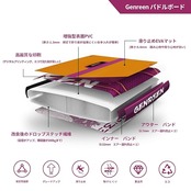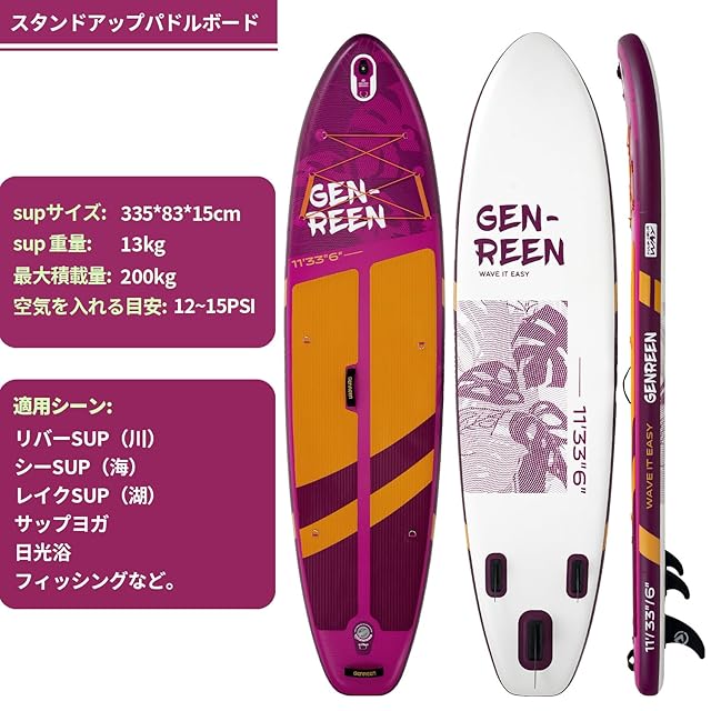 GENREEN パドルボード別名:スタンドアップパドルボード,インフレータブル sup,sup ボード,サップボード,sup パドルボード,インフレータブル サップボードなど。サップボード本体サイズ:335×83×15cm;本体重量:約8kg;包装後重量:約13kg;最大積載量:約200kg(普通の素材だと約130~150kg);SUPボードの付属品:サップボード本体×1、サップボードのパドル×1(3分割仕様)、リーシュコード×1、バランスフィン×3、ダブルアクション空気入れ×1、収納ケース×1、修理用レンチ×1、取扱説明書(英語版)×1