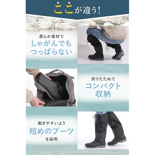 【ひざ下まで防水】長靴以上ウェーダー未満。水深30cm程度に対応し、軽作業や釣り、防災にも最適。