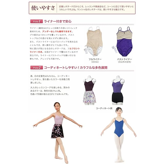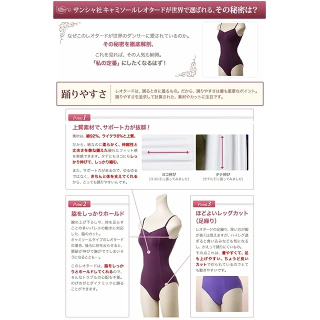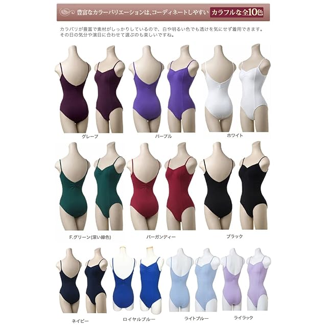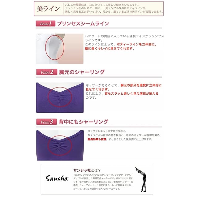 フランスの有名メーカーSANSHAの 高品質バレエレオタード「Manakara」(マナカラ) 世界中のダンサーに人気を誇るフランスのサンシャ製 美しいシルエットのキャミ型レオタード 130cmからのジュニア・大人サイズ 子供用もあるので、親子おそろいでレッスンできちゃいます! シンプルで体のラインを綺麗に見せてくれるレオタード。 シャーリングで胸元からきれいなラインに。 バックもシャーリングで後ろからも美シルエットに。 美ラインを作るもうひとつのポイント レオタードの両脇に入った縫製ラインがボディラインを 立体的に、縦に長く魅せてくれます。 優れたストレッチ性と回復性を備えたライクラ素材を使用 上質な生地でしっかりしていて伸びもよく動きやすい 胸の部分には裏地が付いていて安心設計! ハイレグ過ぎない程よいカットで動きやすい! 股の部分にはマチが付いています 縫製も丁寧できれい コットン混なので季節を問わずお使いいただけます。 ※入荷時期によって裏地の色が異なる場合があります。 製造国:中国 【サイズ選びのポイント!】 普段着られているサイズで大丈夫! 迷われた方は大き目がおススメ。 ■素材■ コットン92% ライクラ8% ■カラー■ バーガンディ・グリーン・グレープ パープル・ブラック・ネイビー・ロイヤルブルー(商品タグ表記はルナと表記されている場合がございます)・ホワイト ■サイズ■ 1(XXS):総丈約52.5cm 身幅約24cm ガース約108cm ウエスト約21cm ヒップ約28cm 2(XS):総丈約55cm 身幅約26cm ガース約114cm ウエスト約22cm ヒップ約29cm 3(S):総丈約57cm 身幅約27cm ガース約118cm ウエスト約24cm ヒップ約30cm 4(M):総丈約59cm 身幅約28cm ガース約124cm ウエスト約25cm ヒップ約31cm 5(L):総丈約62cm 身幅約29cm ガース約128cm ウエスト約26cm ヒップ約33cm 6(XL):総丈約63cm 身幅約31cm ガース約129cm ウエスト約27cm ヒップ約33cm (XXL):総丈約65cm 身幅約33cm ガース約134cm ウエスト約28.5cm ヒップ約35cm ■備考■ 商品撮影にはデジタルカメラを使用しております。 色彩再現には最善を尽しておりますが、画面上と実物では多少色具合が異なって見える場合もございます。 ご了承ください。
