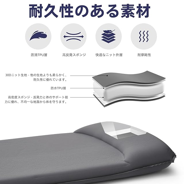 【スマートな30Dニット生地&防水TPUレイヤー】キャンプマットレスの30Dニットアウター生地は、ポリエステルよりも柔らかく、肌に優しく、刺激がなく、破れにくくなっています。 きしむ音がしないので、浅い眠りでも安らかに眠れます。30D密度で低密度による崩壊や高密度による硬さを防ぎます。 防水TPUの裏地が湿気を遮断し、フォームコアを保護しながら、湿った布で拭いてお手入れが簡単です。