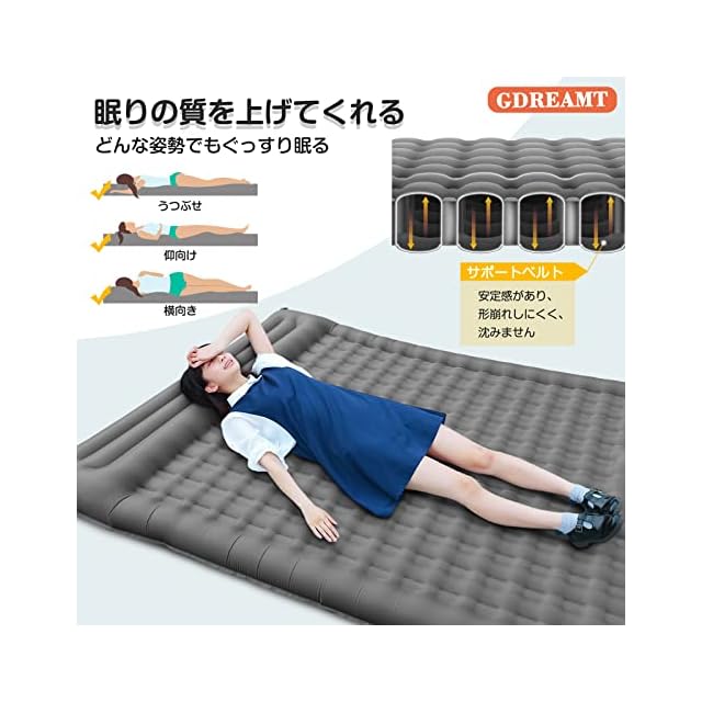 【寝心地よいのダブルエアーマット】超厚手のダブルエアーマットが発売!❶GDREAMTのエアーマットの厚さは12cmで、使用時に地面のゴツゴツ感が体に伝わらず、底つき感もなく、地面からの暑気や寒気もシャットアウトでき、寝心地がいい。寝心地よいを目指している人にはおすすめダブルエアーマット!❷ダブル エアーマット内部には肝心なサポートベルト設計により、体の沈み込みに防ぎ全体の体重をバランスよく支えてくれ、形崩れしにくく、沈み込むこともありません。横向き、仰向け、うつぶせなど、どんな姿勢でもぐっすり眠ることができます。(※座る・膝立ちの状態でも、地面に付く感触はありません。)
