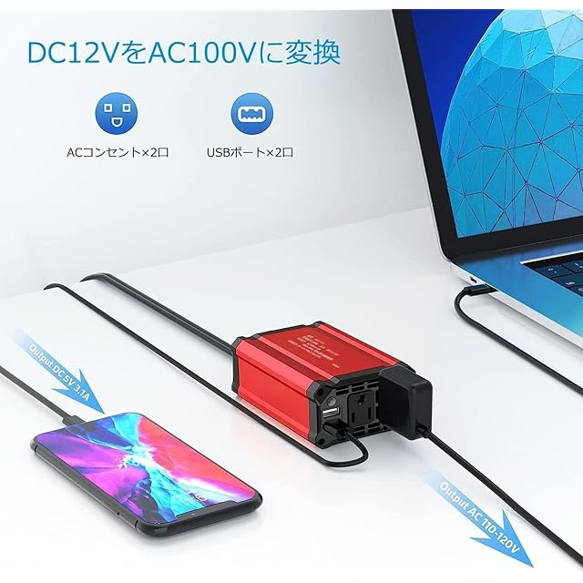 【250W出力&USB充電】 車のシガーソケットから家電もスマホも充電可能!USBポート搭載で、スマホやタブレットを充電。250Wまでの電化製品に対応し、ドライブや車中泊に最適!