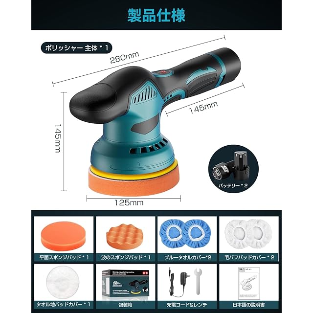 【問い合わせ·包装リスト】このたび電動ポリッシャーをお買上げいただきましてありがとうございます。お問い合わせ方法:「注文履歴」→「該当の注文を選択し商品ページに移動する」→「販売元」→「質問する」。お問い合わせには、24時間以内に返信致します。包装リスト:本体 * 1;マジックテープダイヤル * 1;バッテリー * 2;充電器 * 1;紙やすり * 1;平面スポンジパッド * 1;波のスポンジパッド* 1;タオル地パッドカバー * 1;毛バフパッドカバー * 2;ブルータオル地パッドカバー * 2;専用レンチ * 1;取扱説明書 *1 。ポリッシャーの豊富な付属品は、様々な場面と異なる材質の表面を研磨することができます、ワックス、金属のペンキと錆、木材の研磨、浴室の清潔、大理石の研磨などの用途は品物の元の光沢を回復します。
