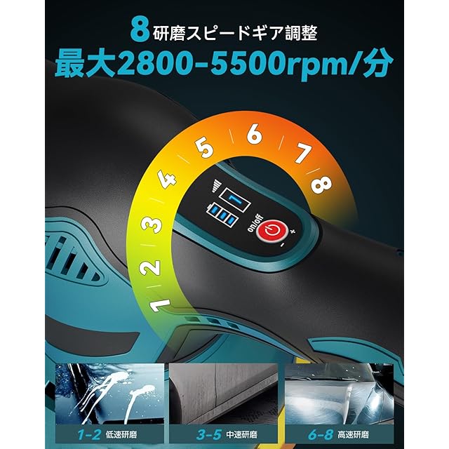 【8段変速2800RPM ~ 5500RPM】この電動ポリッシャーは1 ~ 8段の変速ギアを備えています。スピード調節はボタン式の設計を採用して、簡単で正確にデュアルアクションポリッシャーの回転数を調節することができます。1回長押しして作業を開始し、1回押すごとに回転数が一段ずつ上がります。最低2800回/分から最高5500回/分まで調節できます。あなたは異なる製品と使用のニーズに応じて適切なギアを選択することができ、心配する必要はありません低回転または高使用効果に影響を与える。車の研磨、ワックスがけ、木工、金属研磨、塗装剝落、金属製品の錆取りなど様々な場面で使用できます。