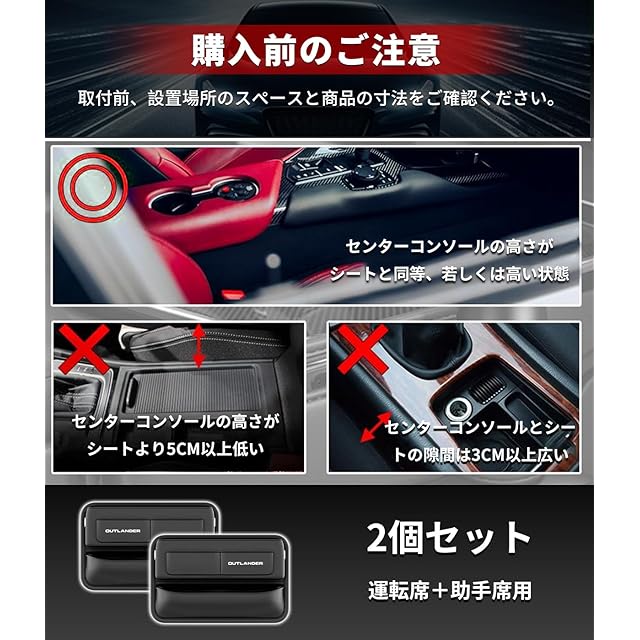 【専用ロゴ・おしゃれな設計】この車用 隙間 収納 ボックス セットは、OUTLANDER 専用ロゴが印刷されており、ロゴが左右の方向を区別されています。この隙間収納ケースの設計がシンプルで美しくて、2個入りのセットで運転席と助手席が同時に小物収納が可能で、同時に美観性と実用性を兼備します。乱雑なものに別れを告げ、きれいなドライブを実現するのに役立ちます。【適用車種】アウトランダー OUTLANDER PHEV GN系に適用します。