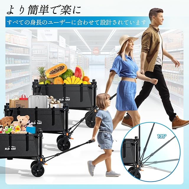 商品名:Elegear アウトドアワゴン キャリーワゴン 200L 耐荷重200kg 容量可変式 全地形対応360°ホイール 折り畳み式 軽量コンパクト設計 キャンプ ビーチ スポーツ ショッピング用