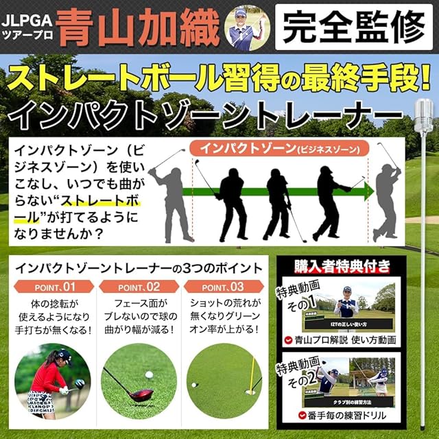JLPGAプロ青山加織監修の信頼性。プロゴルファーである青山加織プロが監修し、実際のプレーで役立つ実践的なトレーニング効果を追求。プロの視点から開発されたこの練習器具は、ゴルファーのスキル向上を強力にサポートします。