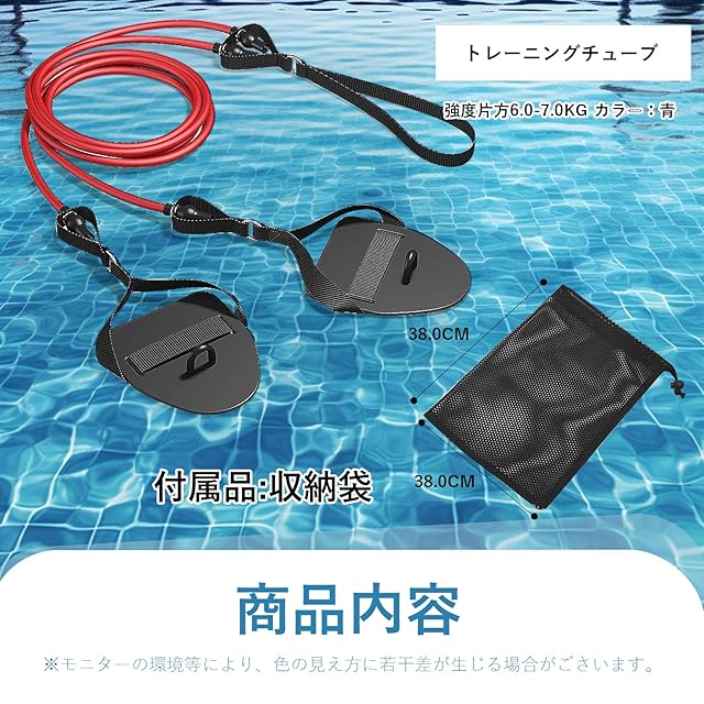 </br>水泳用のトレーニングチューブです。こちらのトレーニングチューブは高弾力で、パドルがついているため、水泳で使う必要な筋力を陸上で強化できるほか、肩周りの柔軟性アップのためにも活用できます。より競技力を向上させる為にご利用ください。</br>トレーニングチューブ、レッド強度:片方で約6.0-7.0kg(中学生から高校生向け)。ブルー強度:片方で約9.0kg(大人向け)。付属:収納袋(サイズ:約38.0cm×38.0cm)※モニターの環境等により、色の見え方に若干差が生じる場合がございます。</br>