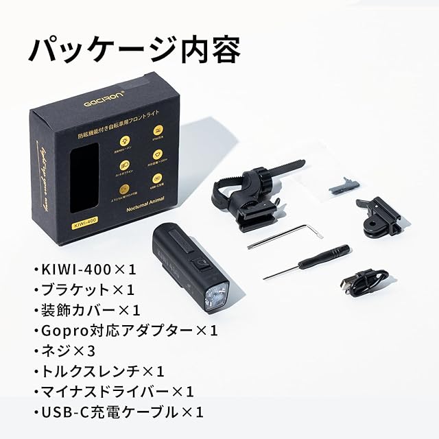 KIWI-400はGacironの自転車用フロントライトで、400ルーメンのアンチグレアビームを搭載し、夜間のサイクリングを安全で快適にします。コンパクトで耐久性のあるCNC加工ハウジング、USB-C充電、IPX6防水、5つの動作モードを備え、さまざまなライディング状況に対応します。<br><br>【スペック】モデル:KIWI-400 光源:LED 最高輝度:400 lm 電池容量:1,600mAh インプット:5V/1.0Ah 充電時間目安:約1.5hrs カットフライン:Cut-off Beam 照射距離:>200m 防水性能:IPX6 本体サイズ:24.2x35x83.2mm 本体重量:約98g<br>【点灯モード・使用時間】高輝度モード:400lm 約2hr 中期度モード:200lm 約 3.5hr 低輝度モード:100lm 約5.5hr プレスモード:100-50lm 約9hr 昼間モード:400lm 約12hr <br>【パッケージ内容】フロントライト ブラケット Gopro対応アダプター(他のブラケットに合わせて使用) 装飾カバー ネジ×3 トルクスレンチ マイナスドライバー USB-C充電ケーブル<br>※仕様変更などにより写真や内容が一部変更となることがあります。<br> ※色は撮影条件・印刷などにより実際の色と異なることがあります。 <br>※商品は予告なく価格変更・販売を終了させていただくことがあります。