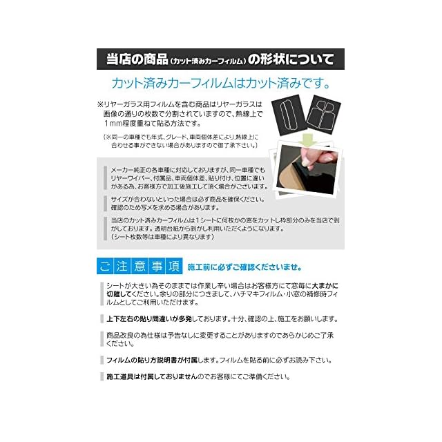 ※リヤーガラス用フィルムは画像の通りの枚数で分割されていますので、熱線上で1mm程度重ねて貼る方法です。(※同一の車種でも年式,グレード,車両個体差により,熱線上に合わせる事ができない場合がありますので御了承下さい。)<BR> メーカー純正の各車種に対応しておりますが、同一車種でもリヤーワイパー,付属品,車両個体差,貼り付け,位置に違いがある為,お客様方で加工後施工して頂く場合がございます。<BR> サイズが合わないといった場合は必ず商品を確保ください。確認のため写メを求める場合があります。<BR> 商品を廃棄後、を求められるお客様がおりますが商品を廃棄された場合は対象外となります。 <BR> 当店のカット済みカーフィルムは1シートにカッ トし枠部分のみを当店で剥がしております。 透明台紙から剥がし利用いただくようにな ります。(シート枚数等は車種により異なります)<BR> ※商品のサイズはお客様のご希望・好みのサイズにはなっておりません。データーを作成するプロが、選んだ適切なサイズです。<BR> 返品に関しては、別ページに記載させて頂いておりますのでご確認後、ご購入ください。<BR> ※シートが大きい為そのままでは作業し辛い場合はお客様方 にて窓毎に大まかに切離してください。<BR> ※上下左右の貼り間違いが多発しております。十分、確認の上、施工をお願いします。 <BR> ※商品改良の為仕様は予告なしに変更することがありますのであらかじめご了承ください。 <BR> ※フィルムの貼り方説明書が付属します。フィルムを貼る前に必ずお読み下さい。 <BR> ※施工道具は付属しておりませんのでお客様にてご準備ください。