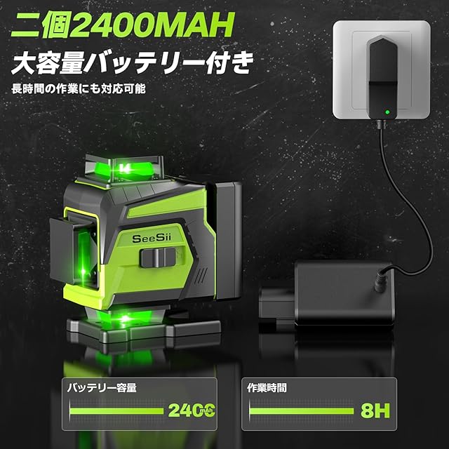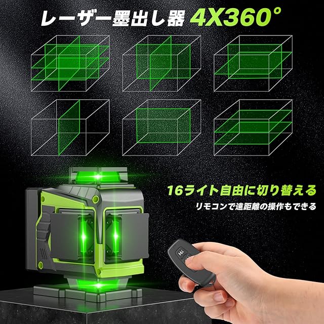 商品名:【2025最新改良】SEESII レーザー墨出し器 4x360° グリーンレーザー 水準器ツール 回転レーザー線 16ライン 緑色 小型 レーザー墨出し器 コンパクト DIY 自動補正 高輝度 高出力 高精度 軽量作業 受光器対応 リモコンコントロール 2個大容量バッテリー 日本語説明書 型番L16-G1