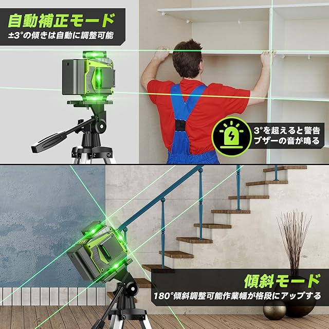 ✅【自動水平補正と手動傾斜モードを搭載】自動水平補正と手動傾斜モードが搭載されており、自動的に水平調整が可能で、補正範囲は ±3°で、指示ランプにより簡単に判明できます。手動傾斜モードでは、レーザーラインが任意の傾斜角度でも使用できるようになり、家具の取り付け、壁の描画、タイルの敷設など、さまざまな測定作業に対応できるため、問題解決をサポートします。付属のリモコンを使えば、高い場所など離れた位置からでも操作でき、作業効率をアップさせることができます。