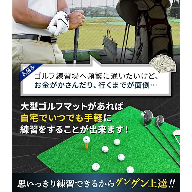 GolfStyle独自の3層構造マットを開発しました。特許申請中の技術となっており、当店独自のゴルフマットとなっております。GolfStyleはリアルな練習を自宅でもできるよう様々なゴルフマットを研究開発しております。こちらのSBRゴルフマットは超大型サイズだから大柄の男性でも余裕でスタンス&ショットが可能です。マットの上に立って打てるので本番に近い環境で思いっきり打てます。表面の人工芝は叩いてもへたれにくい、長く使えるポリプロピレン人工芝を使用、裏面は柔軟性があり、踏んだ時のリアルな芝感を実現したSBR製マットなので、グリーン上に似た感覚でショット練習ができます。お客様のご要望に応え、あらゆるスタンスに対応できるように6カ所にティー用の穴を開けました。左右に開いているのでレフティーの方でも対応しています。また、マットがへたってきても入れ替えて使用ができます。使わないときは丸めて箱にしまうことができます。マットの部分は商品改善を行い、巻き癖が残るEVA製マットから巻き癖がつきにくいSBR製マットに変更しました。丸めても元に戻るの安心してご利用いただけます。サイズは縦幅170cm×横幅100cm×厚さ18mm(人工芝10mm+土台SBRマット8mm)※写真参照、重量は5.0kg、マットカラーはグリーン、素材/材質はSBR、PP(ポリプロピレン)人工芝、各種ゴルフボールやゴムティーなどセット内容をお選びいただくことができます。