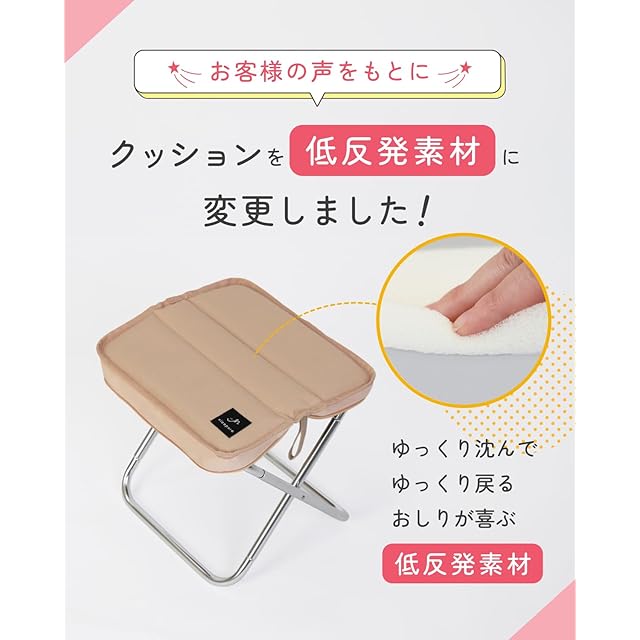 【やわらかいクッション】一般的な折りたたみチェアは座面が薄く、突っ張るのでお尻が痛くなりがち。そこで、やわらかいクッションカバーを被せて2層構造にすることで、座り心地がUPしました!