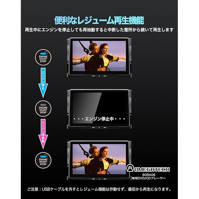 ●レジューム機能対応:改良版2025モデル新機能!再生中にエンジンを停止しても、再始動すると続きから再生いただけます。*USBケーブルを外すとレジューム機能は作動せず、最初からの再生になります。