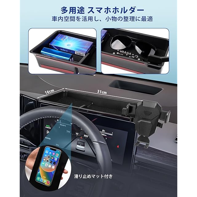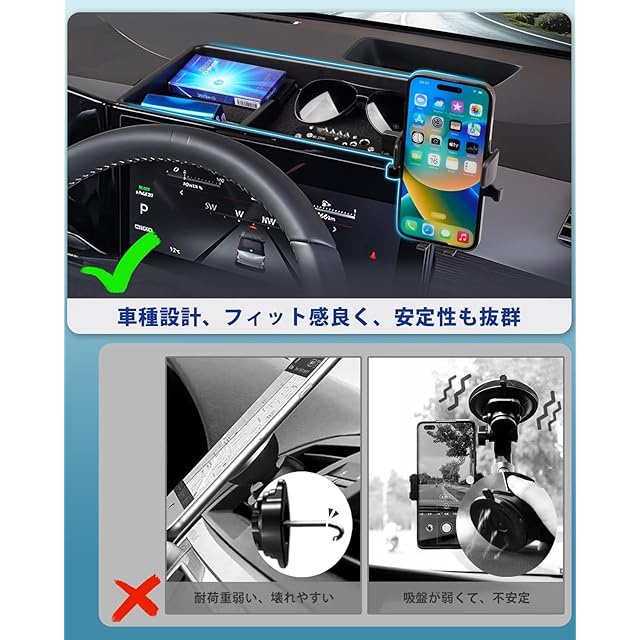 3.【新設計スマホベース】:従来品より、ダッシュボード吸盤タイプは、吸盤が弱くて、落っこちてしやすいし、クリップタイプは、耐荷重が弱く壊れやすく、車内の純正装備を破壊するかもしれません。その問題を解決するように、弊社はナビに設置できる車種専用スマホベースを開発し、お客様に良いドライブ体験を提供できます。それだけでなく、そのベースにはマットが付いているので、滑り落ちにくいです。収納功能もあり、小物を収納出来ます。【抜群な固定性】:車種専用ですので、でこぼこ道でも、揺れたり、落ちたりすることがありません。運転安全性も大いにアップできます。