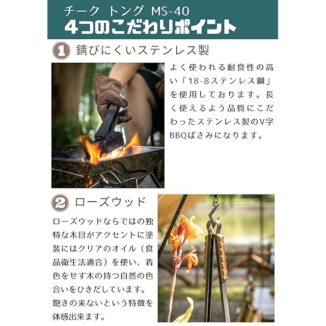 特徴:①ステンレス極太無垢丸棒と天然木を使った火鋏。 ②先端は少し広く平たくなっているため、重い薪から小さめの切炭まで掴めます。