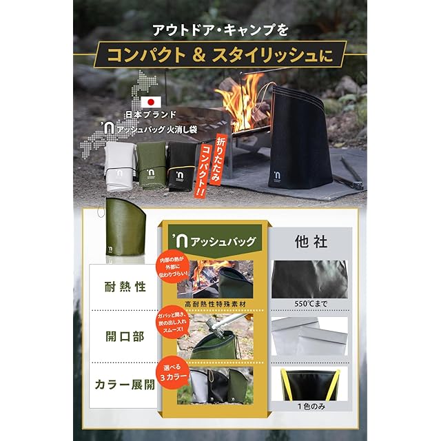 【キャンプ場の悩みを解決!】'nアッシュバッグは使用後の炭や薪の燃えカスを安心安全に持って帰れる耐熱性・難燃性の生地で作られた、耐熱改良版ポータブル火消し袋です。折りたたみ収納可能でコンパクトで携帯性が高く、今やアウトドアに必須のアイテム!キャンプやバーベキュー等焚き火終了後に完全に消化し、薪や炭を持ち帰れます。マチ付き自立型で耐熱性素材で作られており、まだ少し熱を持った使用後の炭や薪の燃えカスを入れたら、袋の口を締め内部を酸欠状態にする事で、完全な鎮火を促し、安心安全に炭を持ち帰る事ができる炭処理火消し袋です。