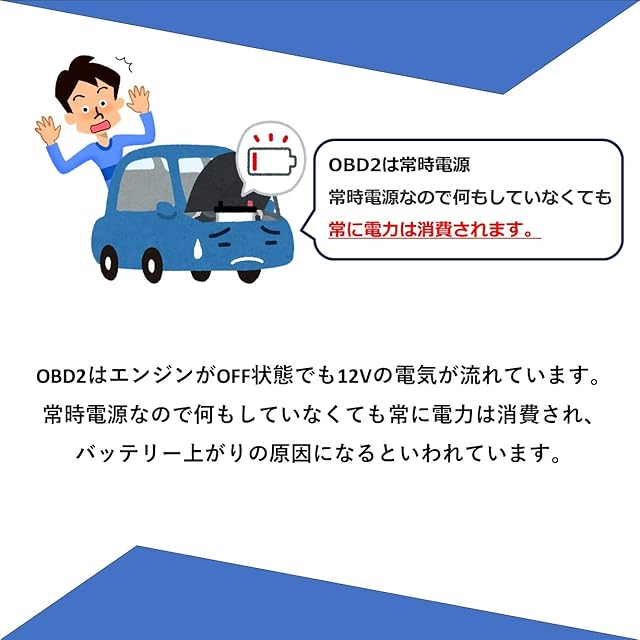 ★OBD2コネクターにドラレコ、レーダー探知機、ELM327、HUD等を接続した際に<br> 常時電源によるバッテリー上がり対策が可能です。 <br><br> ★常時電源からアクセサリー(ACC)もしくはイグニッション(IG)に変更出来るため、<br> 接続機器の暗電流によるバッテリー上がりを防止できます。 <br><br> ★ON・OFFのスイッチが不要で面倒な作業がなくなります。<br><br> ※最新の国産車(マツダ車、トヨタ車)及び輸入車(全般)は使えない場合があります。<br><br> ※配線はOBD2規格のみが接続されています。 <br><br> ※商品以外の不具合(ナビ本体や車両等のへの影響,工賃等)につきましては一切の責任は受け付け致しかねます。<br> いかなる場合で発生した事故,故障に対する保険,等は一切の対応を致しかねます。