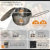 GRANDOORのオリジナル燻製ポッドです。自宅やキャンプで手軽に燻製が楽しめます。おつまみやベーコン、燻製たまご、燻製チーズ等食材も自由自在に選べます。煙が漏れにくい熱燻製専用スモーカーなので手軽につくれてけむりの量も少ないです。すぐに始められるように燻製チップ、燻製網、持ち運びバッグ、燻製レシピ付きです。1.5ℓの容量なので3,4人分の燻製が一回で作れます。IH対応で家庭でも使いやすいです。直径160㎜×高さ90㎜で持ち手部分がコンパクトに折り畳めます。アウトドアブランドGRANDOORが手掛ける燻製鍋です。