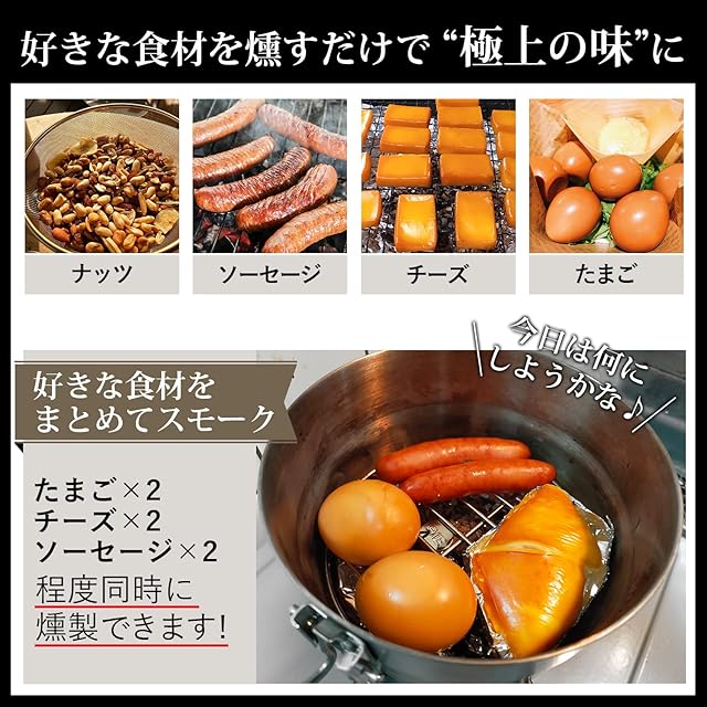 チーズ、燻製たまご、ベーコン、スモークナッツ等燻製のバリエーションも様々に使用できます