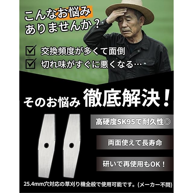 【高硬度SK95高炭素鋼を採用】 雑草の刈り取りに適した金属製二枚刃ブレード(シュレッダーブレード)です。高硬度SK95高炭素鋼を採用し、HRC60相当の硬さで一般的な炭素鋼やSK5製の刃に比べ約2倍の作業面積に対応。耐摩耗性にも優れ、長時間の使用でも安定した性能を発揮するプロ仕様の刈払い機替え刃です。