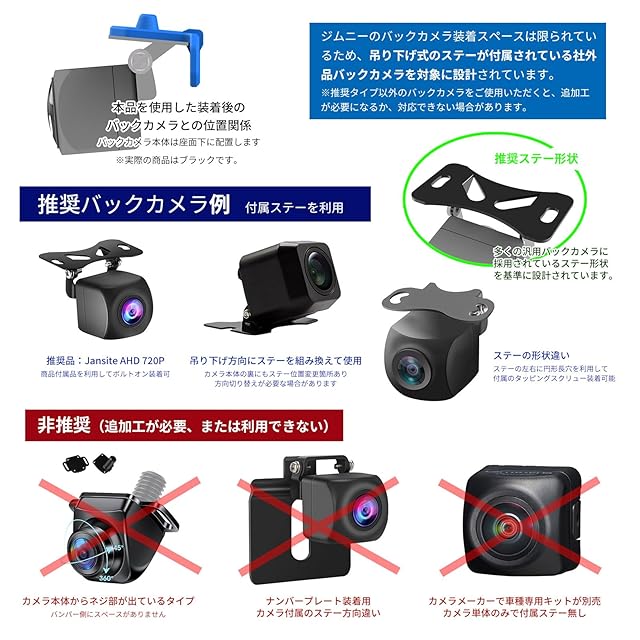 汎用バックカメラ側のステーは「吊り下げ式のステータイプ」が推奨になり、ステー穴ピッチ間29~35mmに対応。汎用バックカメラは別途ご用意ください。