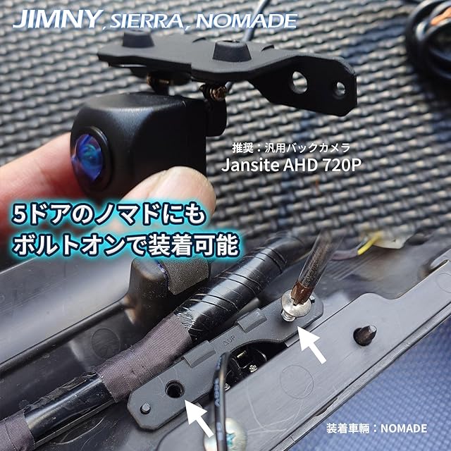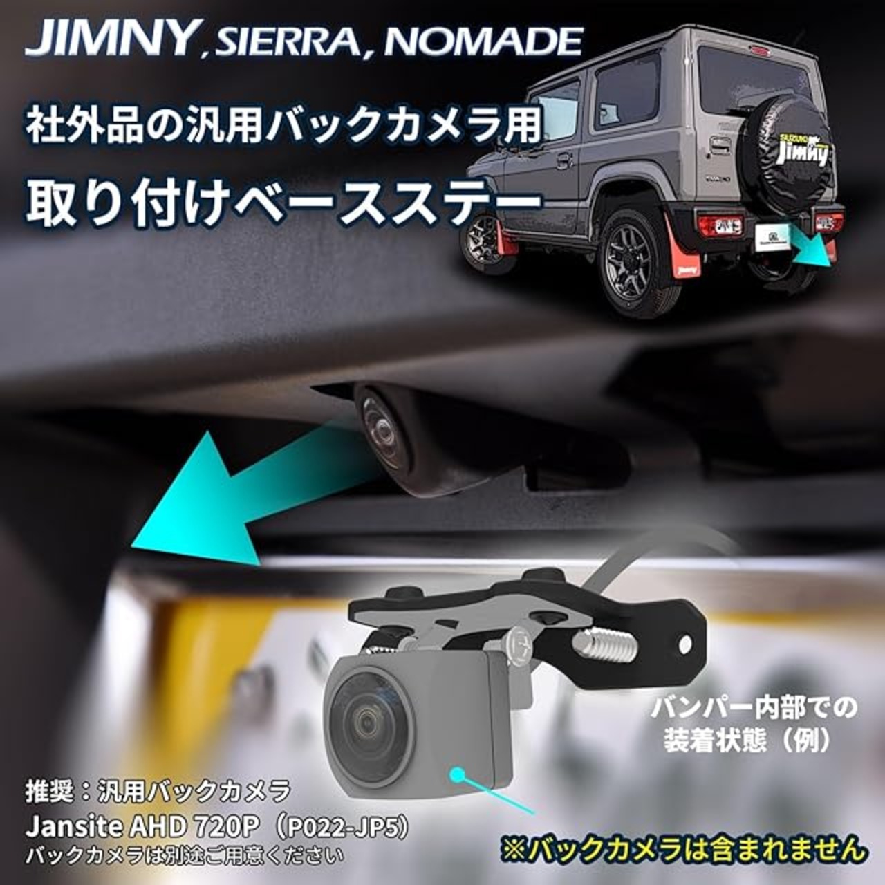 ジムニー・シエラ・ノマド(JB64W,JB74W,JC74W系)に社外品の汎用バックカメラをリヤバンパー内に装着をサポートする取付ベースセットです。 本品を利用して汎用品のバックカメラと組み合わせて装着することで面倒なバックカメラの固定や調整を解消できます。 汎用バックカメラは別売です。推奨する汎用品のバックカメラ「Jansite AHD 720P (P022-JP5)」を利用することでリーズナブルにボルトオンで簡単装着が可能です。