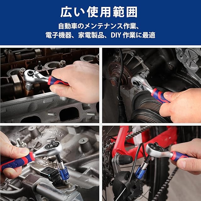 【Cr-V製ビット&ソケットセット】ラチェットハンドルは丁寧な熱処理とメッキ処理を施します。ビットホルダーは1個付きで、エクステンションバーとしても使用できます。ビットとソケットはCr-V鋼材で、より強いトルクに耐えられて、耐久性に優れています。