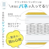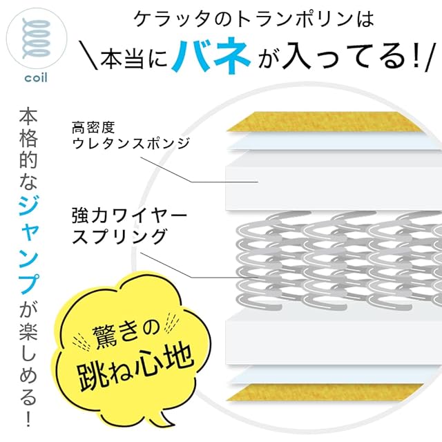 【跳ね心地の秘密は…】本当にバネが入ってる! 通常のクッションタイプのトランポリンは、ウレタンスポンジなどのスポンジ層のみで構成されていますが、ケラッタのトランポリンクッション【FUN!FUN!JUMPER】はコイルスプリング(バネ)を搭載!やみつきになる跳ね心地にとことんこだわりました。耐久性にも優れているので、へたりにくく、長い間お使いいただけます。【しっかり飛べるから楽しさ倍増!】 コイルスプリング(バネ)が入っていると跳ね心地も段違い!まるで本当のトランポリンみたいな跳ね心地に楽しさ倍増!