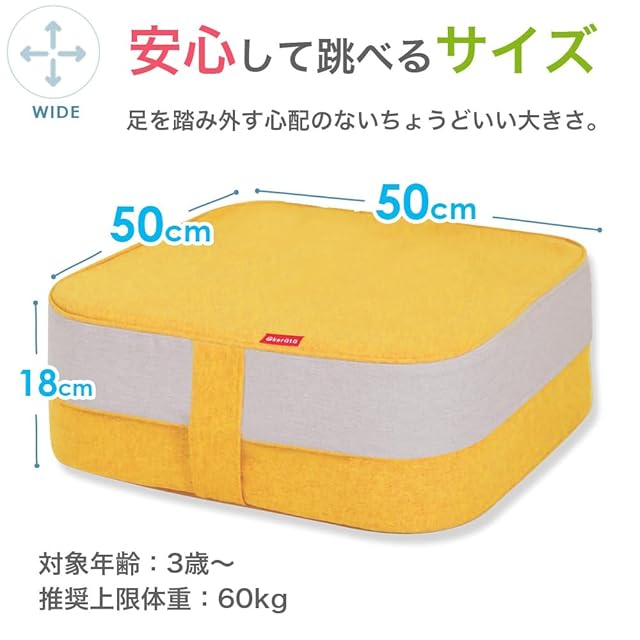 【衝撃と音を吸収し、負担を軽減】内側には衝撃と騒音を吸収する厚さ4cmの高密度ウレタンスポンジを採用。クッション性が高いので、更に弾力性が上がるだけでなく、衝撃と音を吸収、腰や膝への負担も軽減します。【滑り止めつき】底全面は滑り止め加工がされているので、飛び跳ねてもずれる心配がないので、フローリングでも安心してお使い頂けます。【踏み外さない安心サイズ】ケラッタの【FUN!FUN!JUMPER】は50cmx50cmのちょうどいいサイズ。足を踏み外す心配が無いので安心してジャンプを楽しめます。大きすぎないので、インテリアにも自然となじみます。