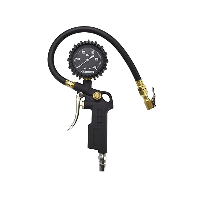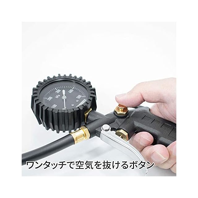 ■商品説明:<br>米式バルブのタイヤに空気を充填するための、エアタイヤゲージです。<br>ゲージの針と目盛りは蓄光塗料を採用し、暗い所でも読み取りやすくなっています。<br>測定範囲を500kPaまでとすることで視認性が向上しています。<br>プッシュリリースが付いているので、タイヤに充填されている空気を、ワンタッチで抜くことができます。<br>エアチャージホース先端は、自動車などに用いられる米式バルブに対応するチャックです。クリップ式ですので、エア充填中にチャックを手で保持しておく必要がありません。<br><br>●ここがポイント!<br>蓄光式で暗所でも視認しやすいゲージ<br><br>■商品仕様:<br>・本体:L210mm<br>・重量:380g<br>・ホース長:385mm(チャック含む)<br>・ゲージ外径:Φ63mm<br>・測定範囲:0~500kPa<br>・最小目盛:10kPa<br>・精度:±13.7kPa<br>・チャック形状:クリップチャック<br>・適用バルブ:米式<br>・機能:プッシュリリース<br>・付属品:エアプラグ(装着済)<br><br>■注意事項:<br>※コンプレッサーの圧力は0.8MPa以下で使用してください。ゲージが破損する恐れがあります。<br>※測定範囲を超えて使用しないでください。<br>※落下や強い衝撃を与えないでください。<br>※しっかりと押し付けた状態でロックできないバルブでは、使用中にエア漏れが生じる恐れがあります。<br>※米式バルブ以外は使用できません。<br>