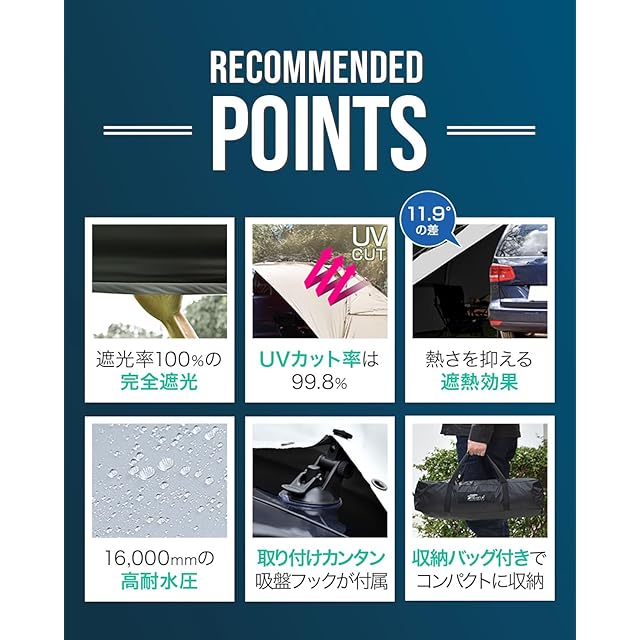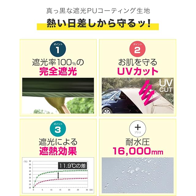 ✅【完全遮光タイプのタープ】遮光PUコーティング生地を採用した完全遮光タイプのカーサイドタープ。光を通さないので遮熱効果もあります。✅【真っ黒な遮光PUコーティング生地で熱い日差しから守るッ!】1.遮光率100%の完全遮光 2.肌を守るUVカット 3.遮光による遮熱効果 4.驚きの耐水圧16,000mm