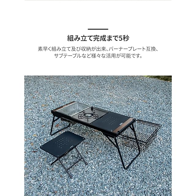 組み立て完成まで5秒 素早く組み立て及び収納が出来、バーナープレート互換、 サブテーブルなど様々な活用が可能です。