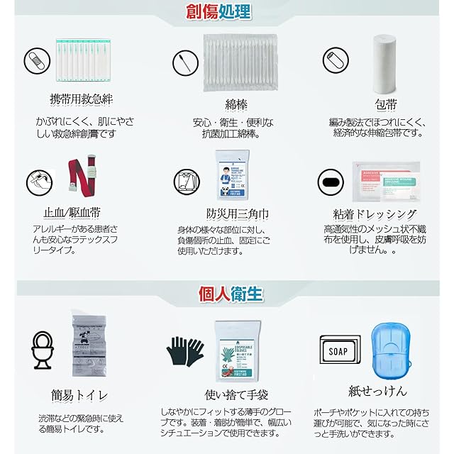 【多目的用途】これは、様々な生活シーンに柔軟に対応できる救急セットです。カナビラと視認性の高い赤十字のロゴを備え、登山・キャンプ・車載・アウトドアスポーツ時の携帯にとても便利です。その他、オフィスの引き出し・子供の学校・旅行用バックパックに入れても場所を取りません。もちろん、地震・自然災害への防災グッズとしてもおすすめです。