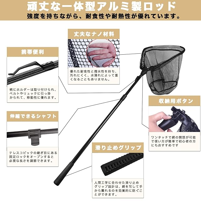 【頑丈な一体型アルミ製ロッド】当社の漁網伸縮ロッドは一体型アルミ合金シャフトを採用し、従来のロッドより折れにくくです。強度を持ちながら、耐食性や耐熱性が優れています。耐食性が抜群、海水、淡水、多数の場合で使えます。素材の強度も抜群、最大耐荷重は5kg。