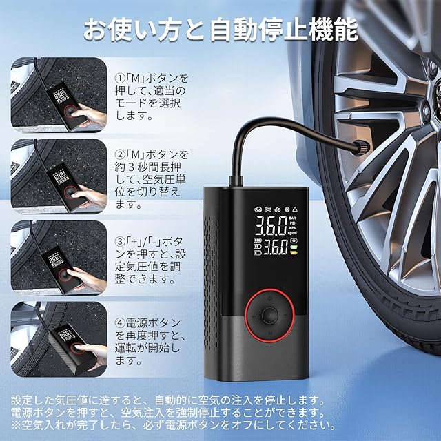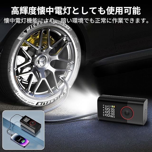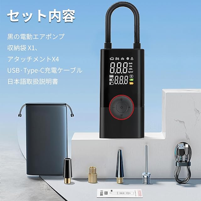 商品名:電動空気入れ 自転車 バイク 車 用 充電式 コードレス バイク 空気入れ 最大圧力150PSI 多機能エアーポンプ 大容量電池 Type-Cポート 電動エアコンプレッサー 自動停止SOS/LCD表示/LED懐中ライト 車/自転車/ボール/浮き輪に適用 小さくて持ち運びやすい 収納袋 日本語取扱説明書付き