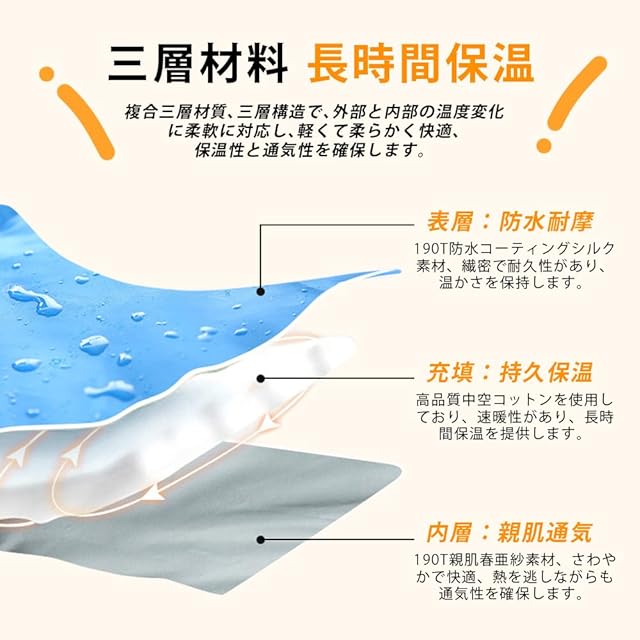 【優れる素材】表地:耐水性と耐引き裂き性超防水ポリエステル100%。 中綿:防寒性が優れいるポリエステル100%、 保温性能が高いです。裏地:上質な繊維素材で質感がよく、ふとんのように柔らかくて肌触りがよい、寝袋に入った時すぐに温かみを感じることができます。
