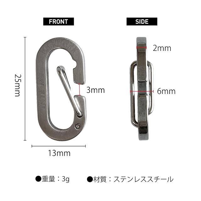直径2.5cmのミニサイズのカラビナで、開口部は鍵の落ちにくい2mm。