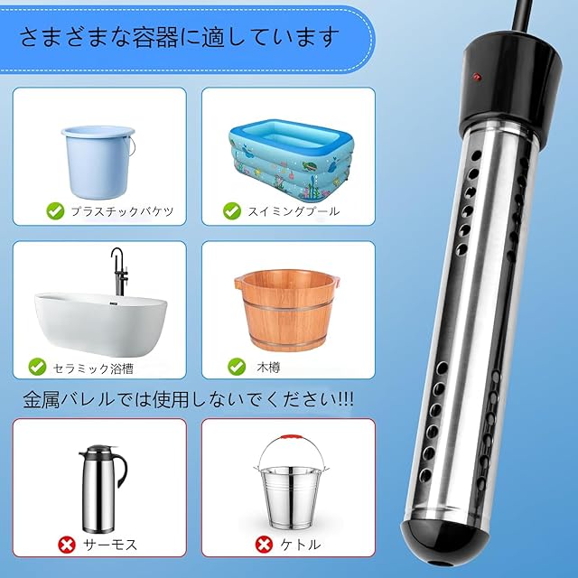 ✔多用途: このポータブルバレル給湯器は、バケツ、浴槽、シンク、洗面台、さらにはミニインフレータブルプールなど、さまざまなサイズの容器に適しています。軽量設計なので、農作業、車の除雪、冬の洗濯、キャンプ、旅行など、さまざまな用途に最適です。家庭や屋外でのアクティビティに最適です。 (水の量によって加熱時間は変わります)