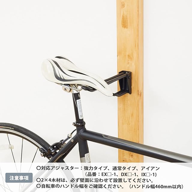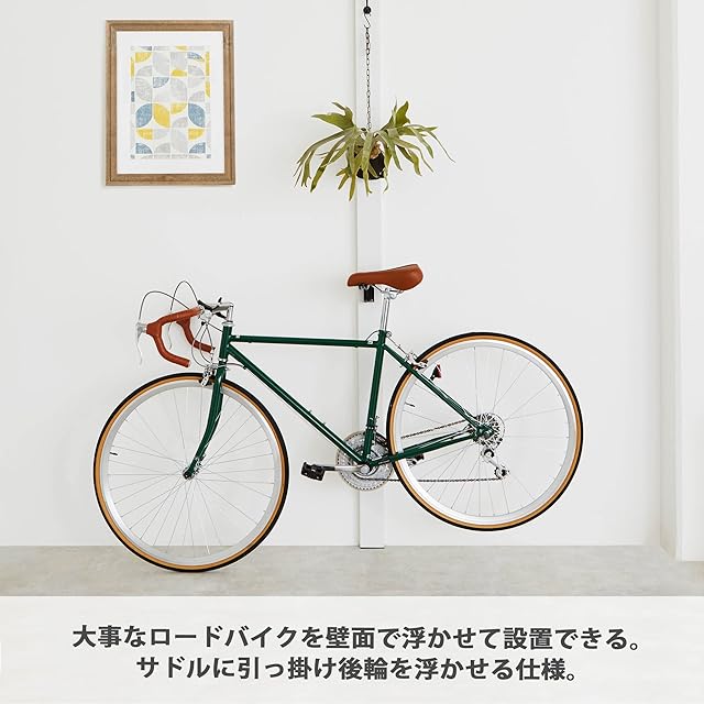 重量15kg、ハンドル幅460㎜までのロードバイクに対応するバイクハンガー。サドルを掛けて後輪を浮かせることで簡単に保管、メンテナンスができる。
