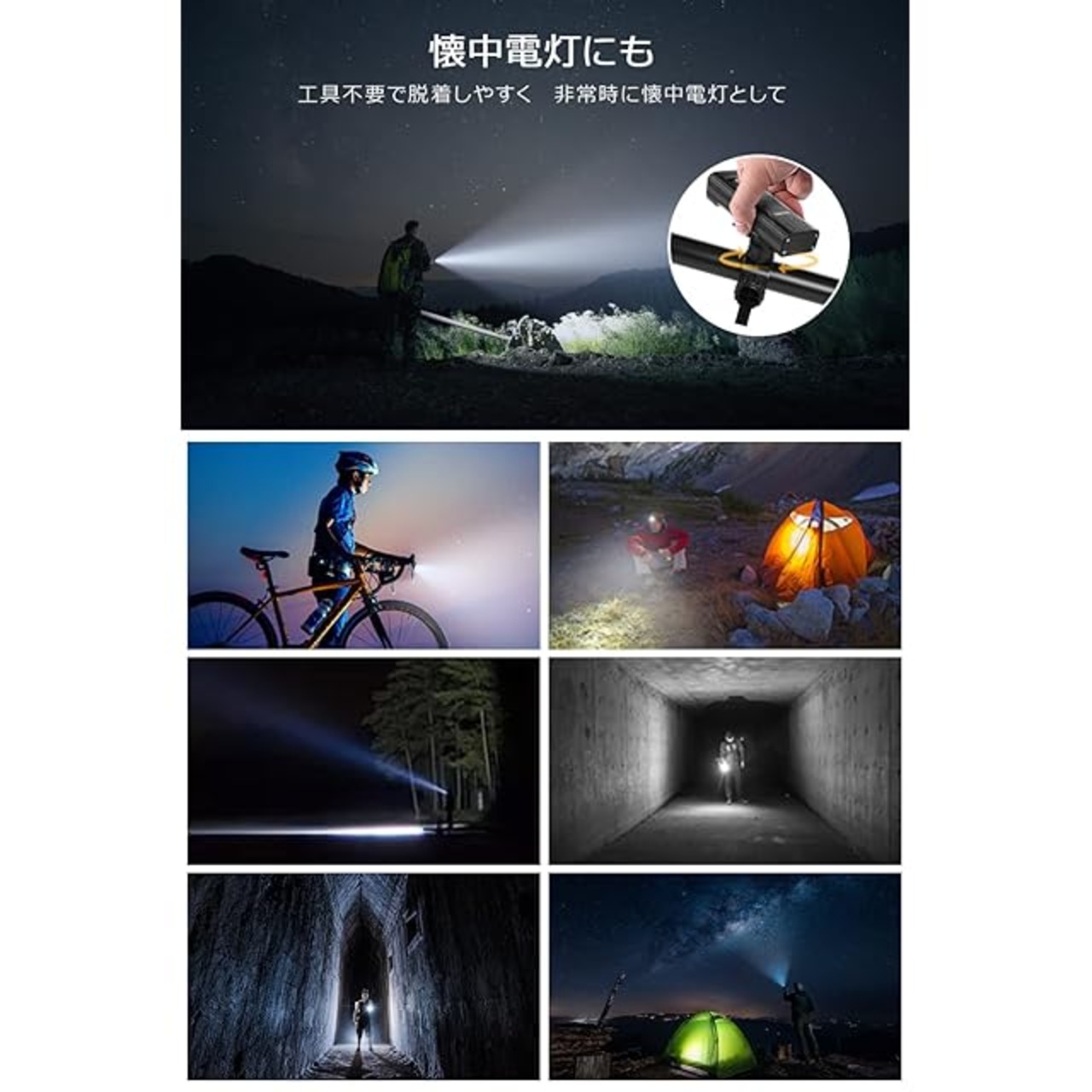 【高輝度ランプ】6つ強力ランプを搭載、最大1000ルーメン、190°広範囲照射により、夜間運転中の視認性を高めることと、周囲のドライバーや歩行者に自転車の存在を知らせることに役に立ちます。さらに、キャンプ、登山、夜釣り、夜の散歩、停電時、非常時など、様々な場面に懐中電灯兼用にも活用できます。