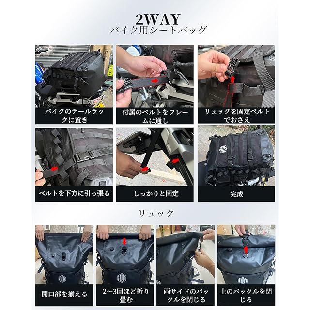 【2WAY】①日常リュック:アウトドア、通勤通学、出張、釣りや川遊びなどの水辺のアウトドアリュックはもちろん。②シートバッグ:固定ベルト2本がついてますので、バイク/自転車などに固定できます。
