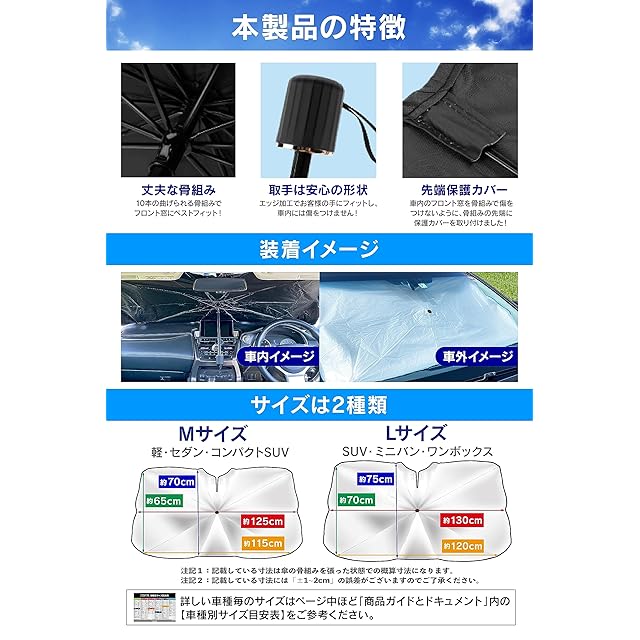 ✅【製品スペック】傘式サンシェード、Mサイズ/Lサイズ、本体生地材質 ポリエステル、骨組み本数 10本