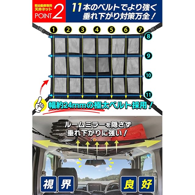 ✅【ご注意ください】重たい物、先が尖ったものや刃物はネットが破れる可能性ある為、万一落下した際に乗員がケガをする恐れのあるものは乗せないよう注意してください。重たい物は、破損、ネットの垂れ下がりの原因となる為、なるべく軽い物を天井ネットに収納してください。重たい物や、刃物、先が尖ったもの、天井ネットの破損につながるものはトランク等のスペースに収納sて下さい。