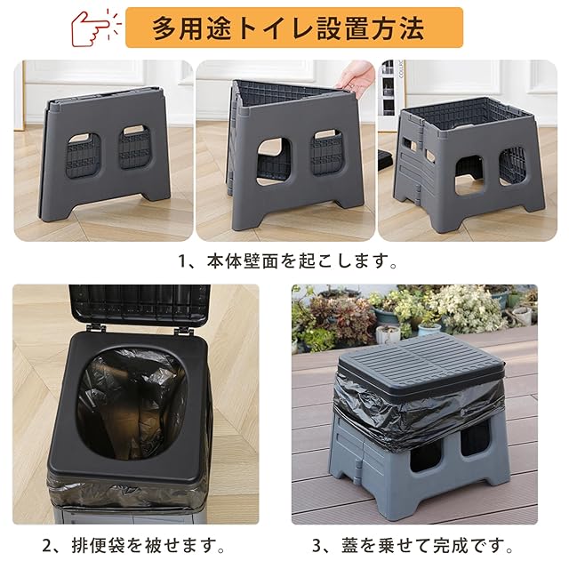 【様々な場面で大活躍】折りたたみ式の非常用トイレ、災害や車中泊、登山、アウトドア、キャンプ等様々な場面で大活躍!トイレ以外にも、踏み台、椅子、ゴミ箱等多用途でお使いいただけます。