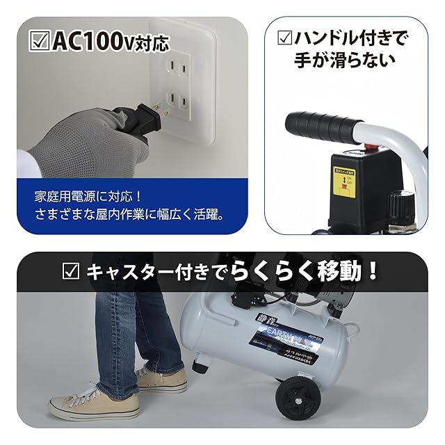 高儀(Takagi) EARTH MAN 静音タイプ オイルレス エアーコンプレッサー 22L ACP-22A 空気入れ 吹き飛ばし 静かな作動音 オイル不要 メンテナンス 簡単 キャスター付き たかぎ TAKAGI