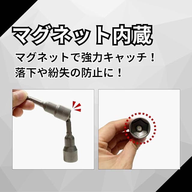 安心ブランド「Longsafe」<br> <br> インパクトドライバー用のソケットビット10種セットです。<br> 六角ボルト、ナットの着脱、自動車の部品交換や機械修理など家庭用DIYからプロまで様々な用途にお使いいただけます。<br> <br> ◆豊富なサイズ展開<br> 6mm〜19mmまでのサイズに対応しているので幅広くご使用いただけます。<br> <br> ◆磁石式<br> マグネットが内蔵されているので、ビットのセットが簡単で紛失の心配もありません。<br> <br> ◆仕様<br> 材質:クロムバナジウム鋼<br> 軸径:6.35mm(1/4インチ)<br> 全長:6.5cm<br> サイズ:6mm、7mm、8mm、10mm、12mm、13mm、14mm、15mm、17mm、19mm<br> <br>